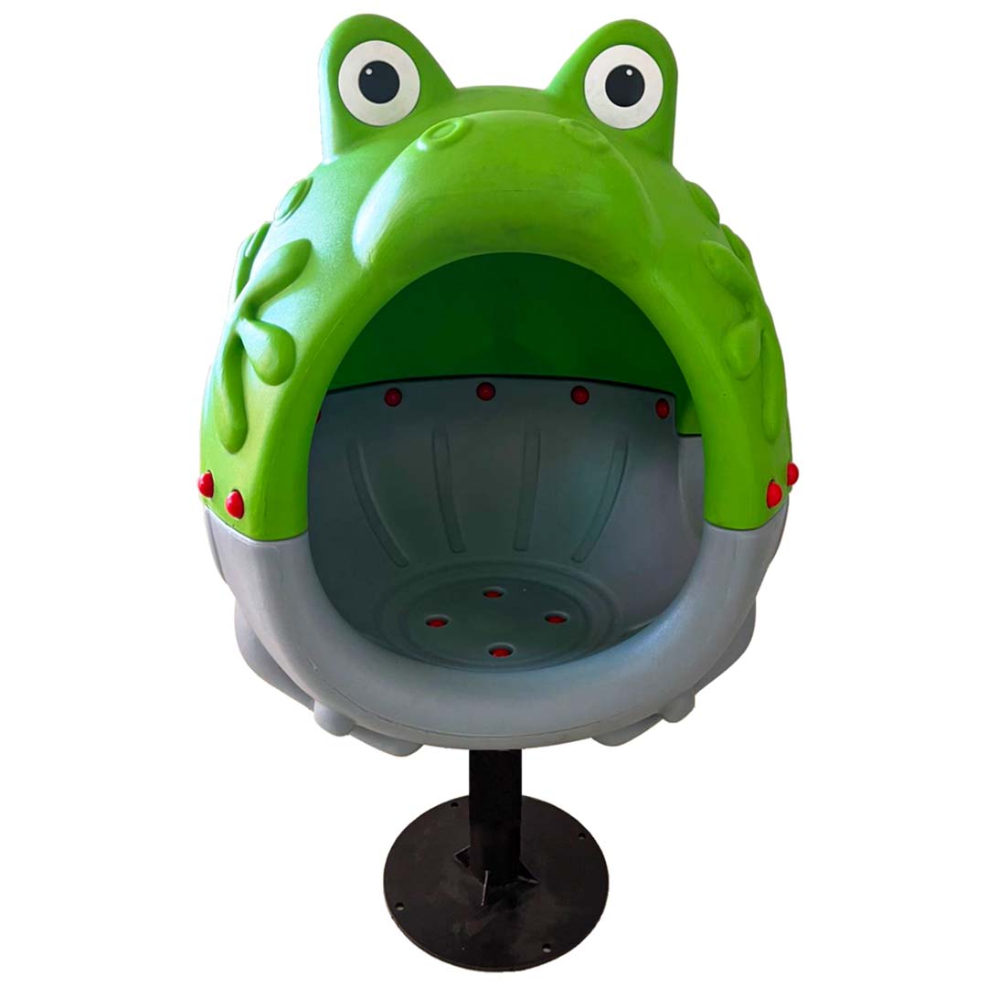Giratorio infantil Rana, fabricado en plástico de rotomoldeo y base de acero galvanizado con acabado en pintura electrostática. Medidas: diámetro 0.85 m x 0.73 X 1.40h m. Capacidad: 1 Niño. Edades: 3 a 8 años.
