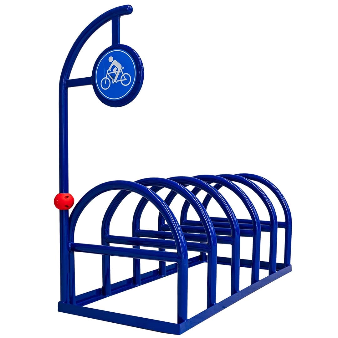 Aparcabicicleta fabricado en acero galvanizado con acabado en pintura electrostática, placa de solera barrenada en base de postes para su fijación al concreto mediante taquetes expansivos de 4″.