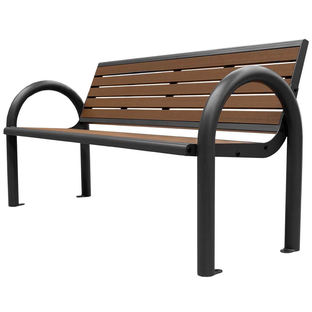 Banca con respaldo fabricada con madera plástica y estructura de acero al carbón y acero galvanizado con recubrimiento en pintura electrostática color gris mate.