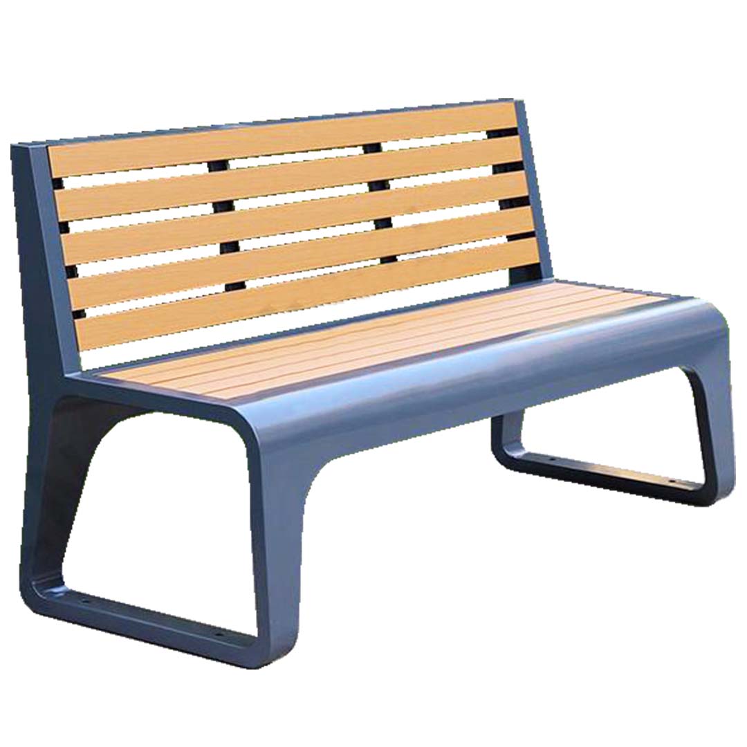 Banca fabricada con estructura de acero inoxidable, con recubrimiento en pintura electrostática color gris y asiento de madera plástica PS. Diseño resistente para uso exterior.