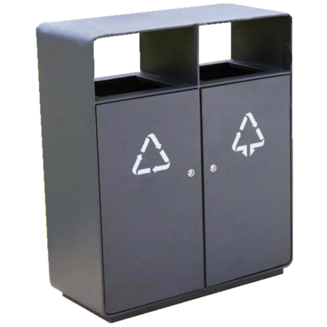 Bote doble para residuos fabricado en acero galvanizado con recubrimiento en pintura electrostática, color gris oscuro. Cuenta con contenedor interior de chapa galvanizada.